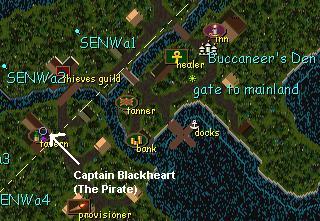 You find the captain in "The Pirate's Plunder" pub in Buccaneer's Den.