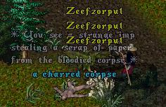 You've found a charred corpse! Take a look at it. Oh no! It's the infamous imp, Zeefzorpul! And he's taken a piece of paper from the body! Come back, Zeefzorpul! Come back!