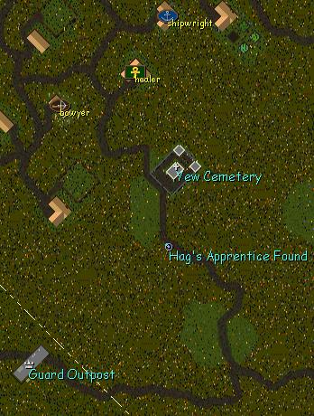 Now, head up along the road, going towards the Yew Graveyard, looking for the hag's apprentice.