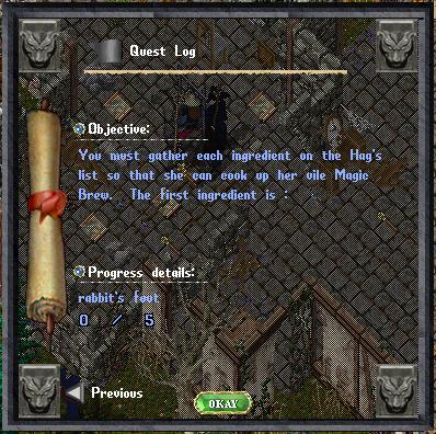 Now then, since you've recovered my Magic Brew Recipe, I suppose you expect a reward? Well, you can keep on expecting, and I can go on being ugly. What good is it to me that I have the list, if I don't have an apprentice to gather ingedients and perform the tasks themselves!