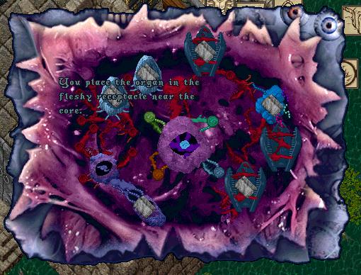The healthy gland's purple color will then flow to the squid-looking thing, turning it purple too. Cut it open to get your last innards. You don't need to do this if you've already gotten your 4 colors of innards from the organs. The innards are all you need to open up the nerve center, so place those colored brains as soon as you get them.