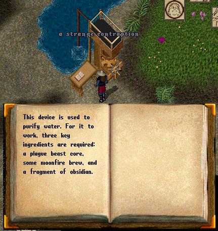 After doing that, you'll have either gained in compassion or sacrifice(If you are able to that day). Don't do it more than once per day if you're trying to gain in virtues as it seems you can only gain in them once per day. This contraption was apparently created to assist the Solen Matriarch purify her water supply(As dictated by BNN fiction). It's not known if this quest has anything to do with Trammel Yew's swampy state or turning it back to normal. It's also not known if there is any greater reward other than gaining in virtue. At this time, you get sacrifice or compassion. Err, well that's not certain either. Having not completed the quest it's hard to say. Many people say they only gain sacrifice, and many say they only gain compassion, while others insist they get nothing. So why do this quest? Hrmm, well, I suppose you can think of it as a gamble. If you believe there will be some result later on such as a beneficial outcome or a reward, then do it. If you think it's just a means of gaining sacrifice, you probably won't want to. Unless you have the hankering to raise sacrifice that is.