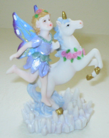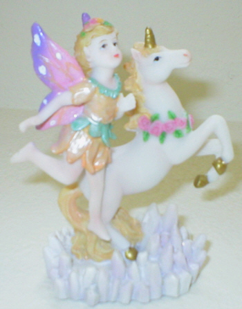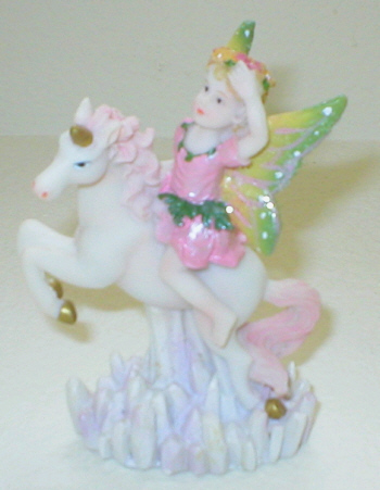 Description: A beautiful fairy in pink, mounted on her unicorn companion.