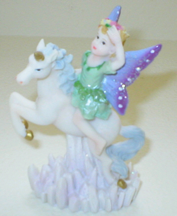 Description: A beautiful fairy in green, mounted on her unicorn companion.